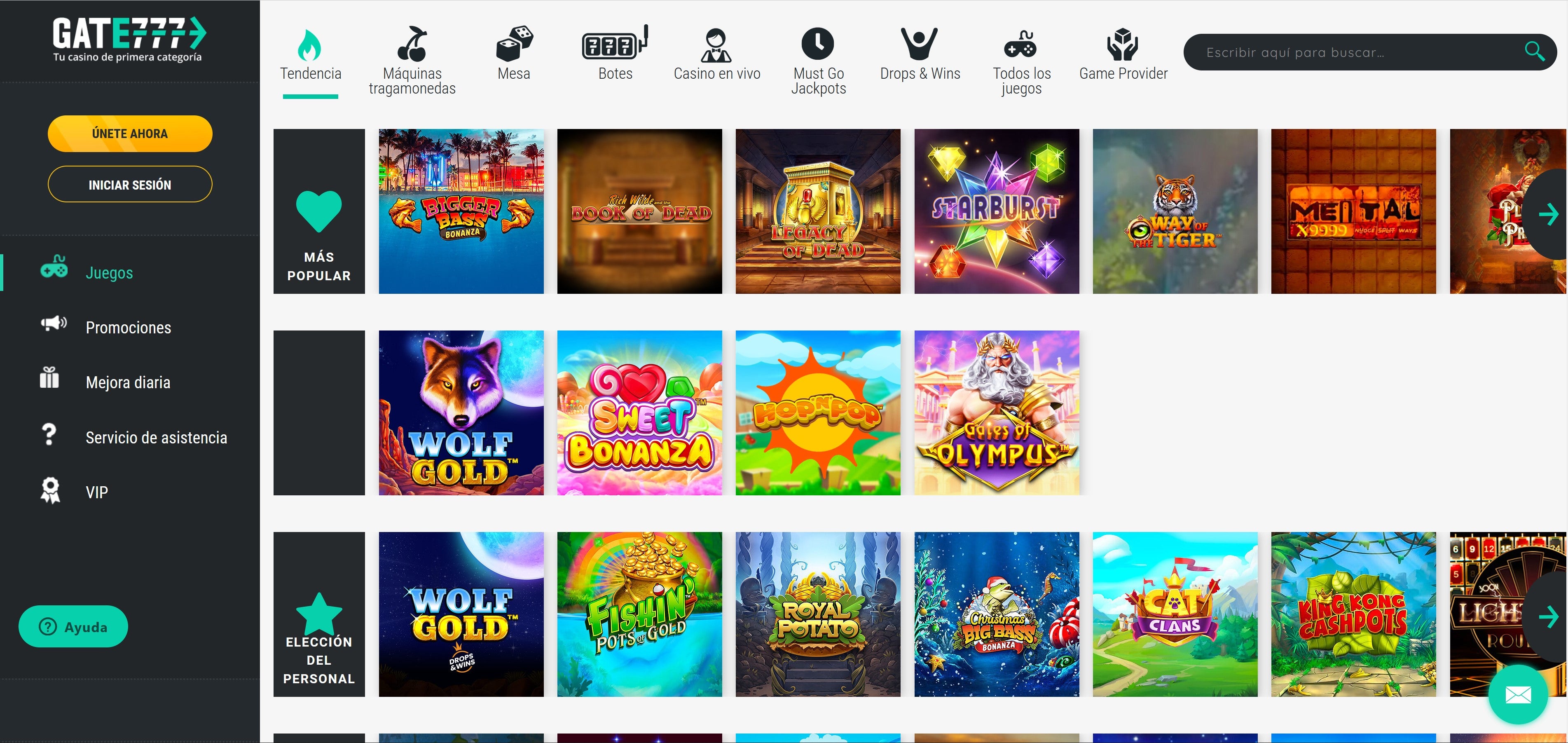El sitio de Gate777 tiene un diseño minimalista, con la página principal muestran secciones con novedades, títulos populares y tragamonedas con pozos como Drops & Wins y Must Go Jackpots. Un detalle que resaltamos de Gate777 Casino es la sección editorial donde sugieren títulos preferidos por su personal, lo que entrega un tono más cercano con el usuario.